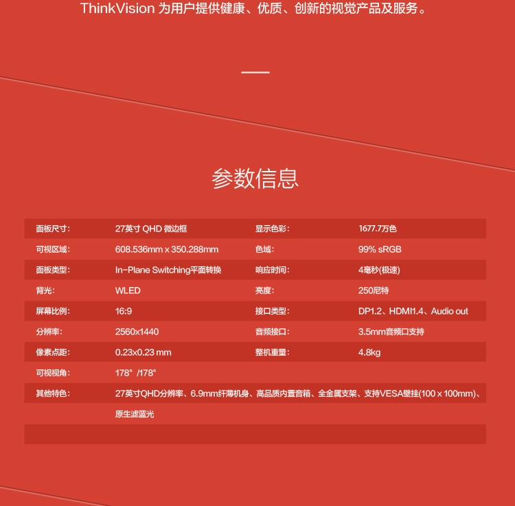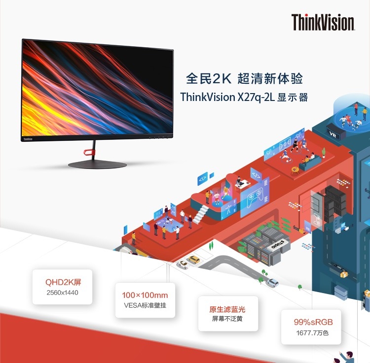 27英寸IPS屏2K原生滤蓝光纤薄边框 99%sRGB 内置音箱 电脑显示器(HDMI/DP接口)