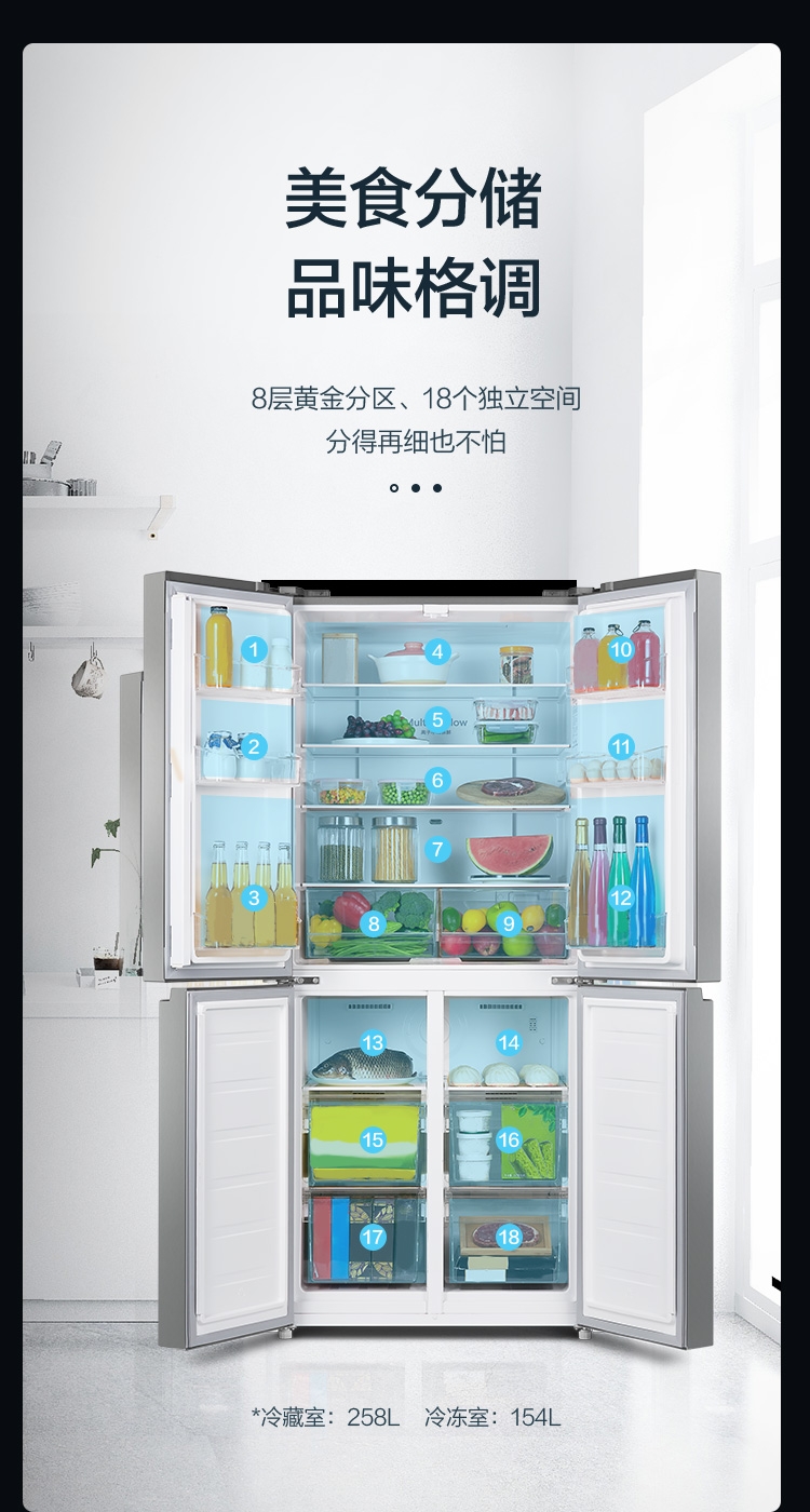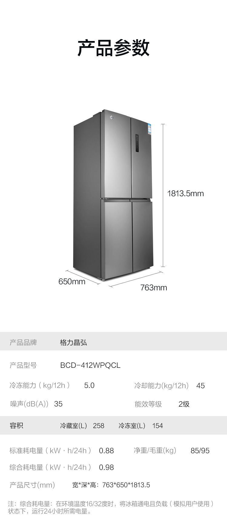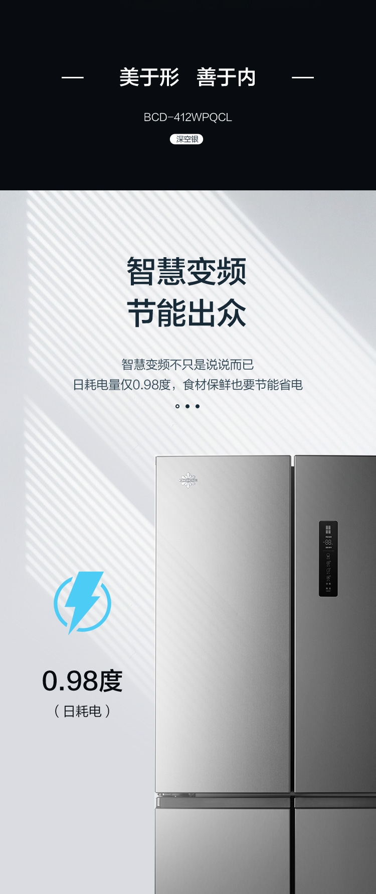 晶弘412升变频风冷十字对开门纤薄电冰箱 深冻锁鲜 家用 离子抗菌净味